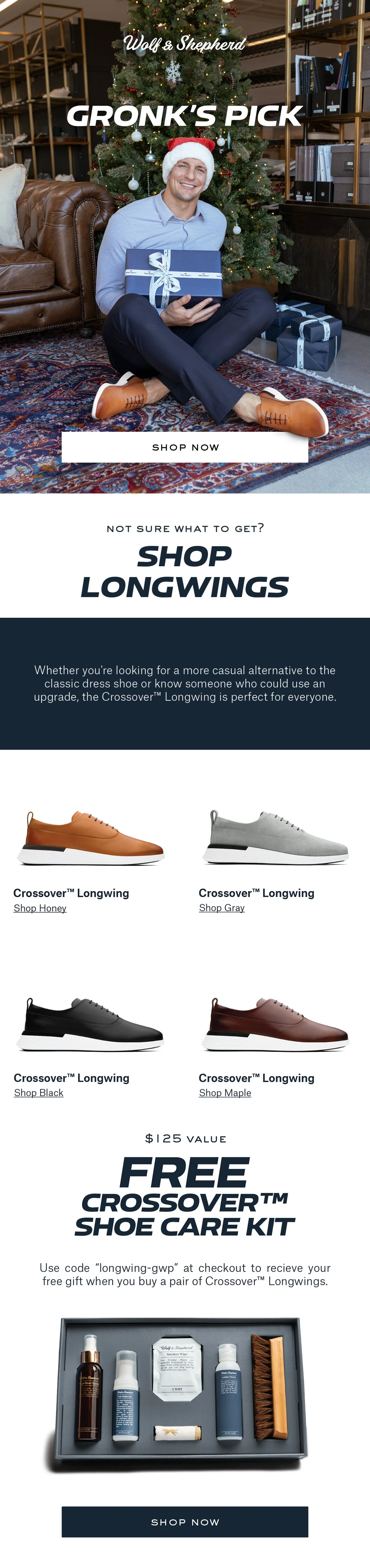 For Wolf & Shepherd’s peak holiday push, I art directed and designed the “Buy a Pair, Pick a Gift” campaign, blending premium storytelling with performance-driven urgency. The creative rolled out across email and digital ads, with visuals that highlighted both the limited-time promotion and the elevated style of Wolf & Shepherd’s footwear.
