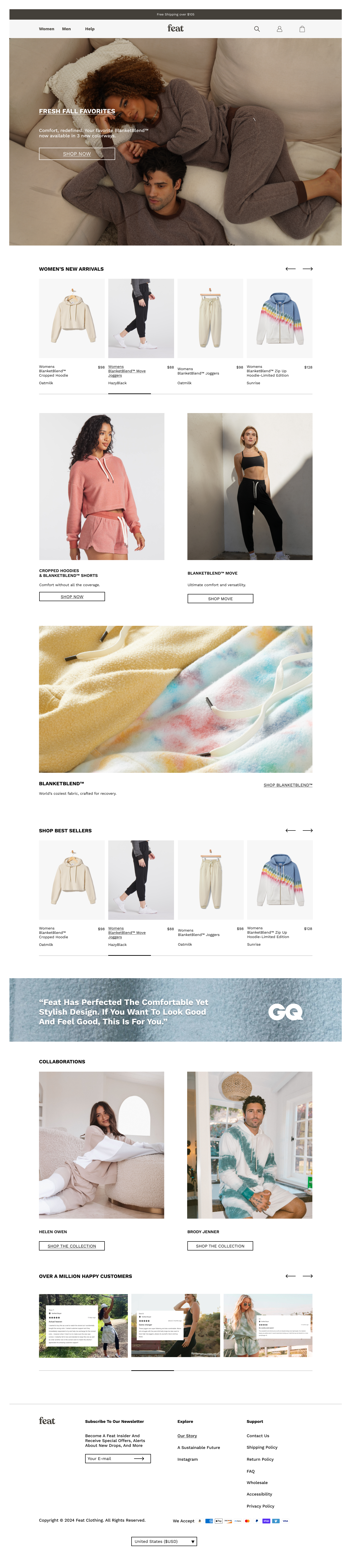 I led the creative direction and design across all pages — from homepage and product detail pages to landing pages, navigation, and checkout — shaping a clean, intuitive interface that placed the product at the forefront while strengthening the brand’s storytelling. The result was a site that balanced ease of use with an elevated visual identity, improving performance while reinforcing Feat’s long-term vision.